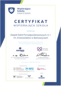 Nasza szkoła znalazła się w gronie 55 placówek z całej Polski, które pomyślnie ukończyły cykl szkoleń poświęconych budowaniu dobrostanu psychicznego dzieci i młodzieży w środowisku szkolnym. Certyfikat w imieniu szkoły odebrała Katarzyna Remiszewska, psycholog z naszej szkoły.